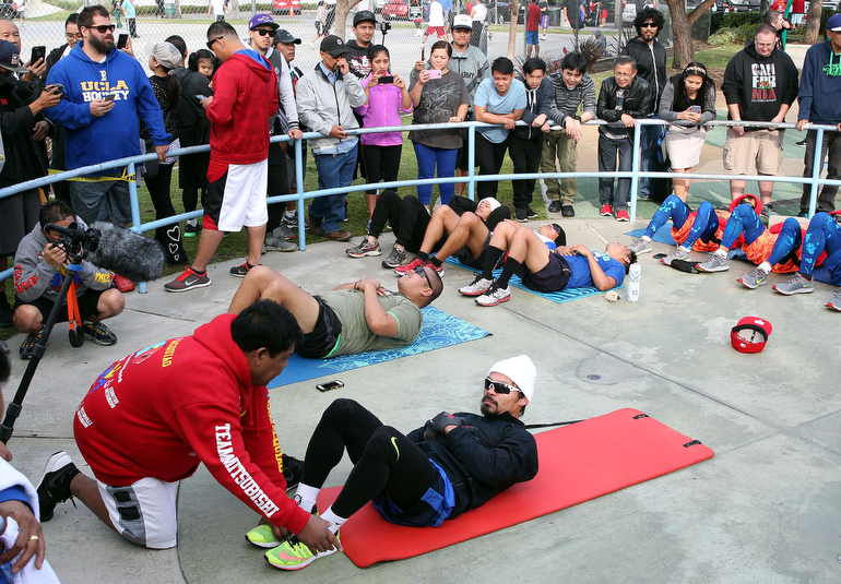 Superstar Manny Pacquiao does his morning situps as crowds of fans watch him prepare for his upcoming 12-round welterweight world championship unification mega-fight against Floyd Mayweather.