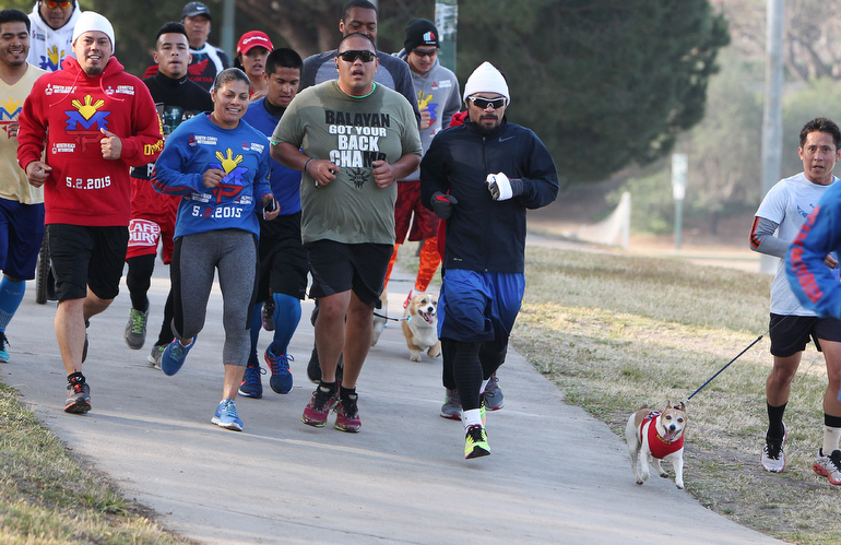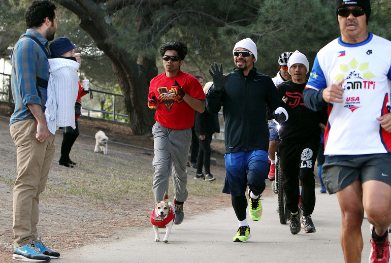 Manny Pacquiao waves at two generations of Pacman fans as he passes them on his morning run in preparation for his upcoming 12-round welterweight world championship unification mega-fight against Floyd Mayweather.