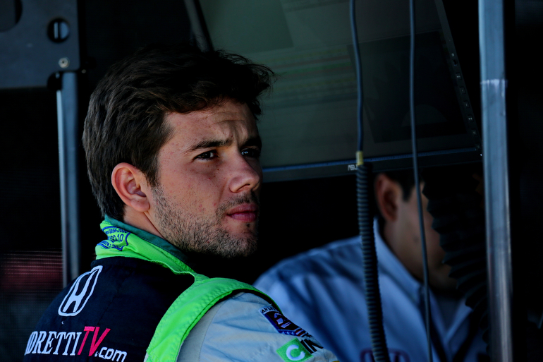 Carlos Munoz waits in his pit stand prior to practice for the Honda Indy 200 at Mid-Ohio — Photo by: Chris Jones