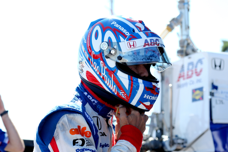 Takuma Sato straps on his helmet on pit lane prior to practice for the Honda Indy 200 at Mid-Ohio — Photo by: Chris Jones