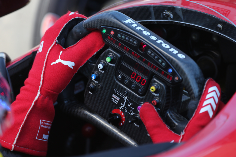 The hands of Scott Dixon begin dial in steering wheel settings prior to practice for the Honda Indy 200 at Mid-Ohio — Photo by: Chris Jones