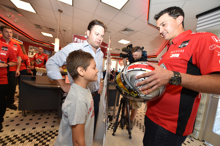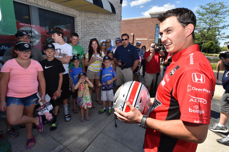 Graham Rahal shows his Ohio State Buckeyes inspired race helmet he will use for the Honda Indy 200 at Mid-Ohio — Photo by: John Cote