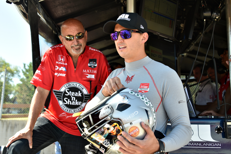 Graham Rahal in his pit stand with his father, Bobby, prior to practice for the Honda Indy 200 at Mid-Ohio — Photo by: John Cote