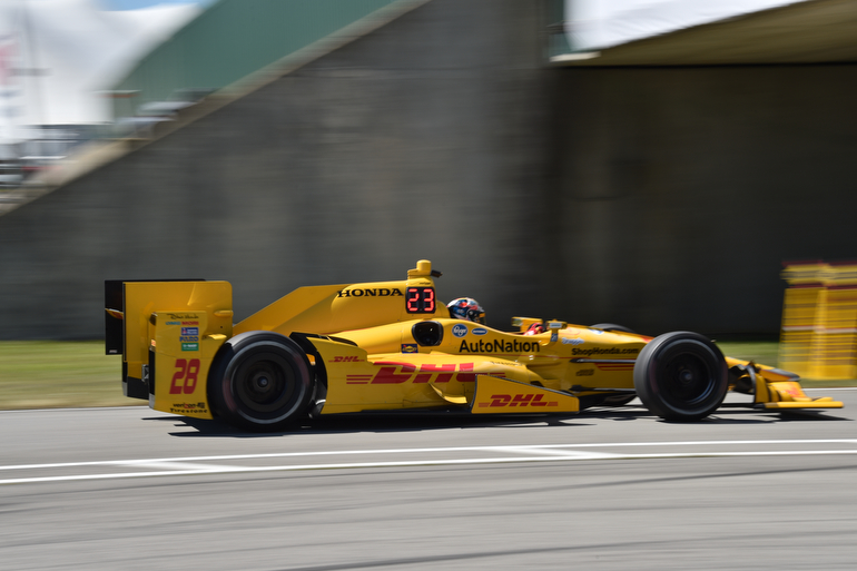 Ryan Hunter-Reay exits pit lane to take to the course for practice for the Honda Indy 200 at Mid-Ohio — Photo by: John Cote