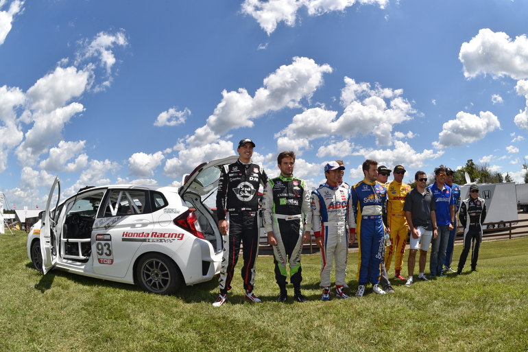 Honda drivers line up next to the Honda Fit they will be climbing into at the Mid-Ohio Sports Car Course — Photo by: John Cote