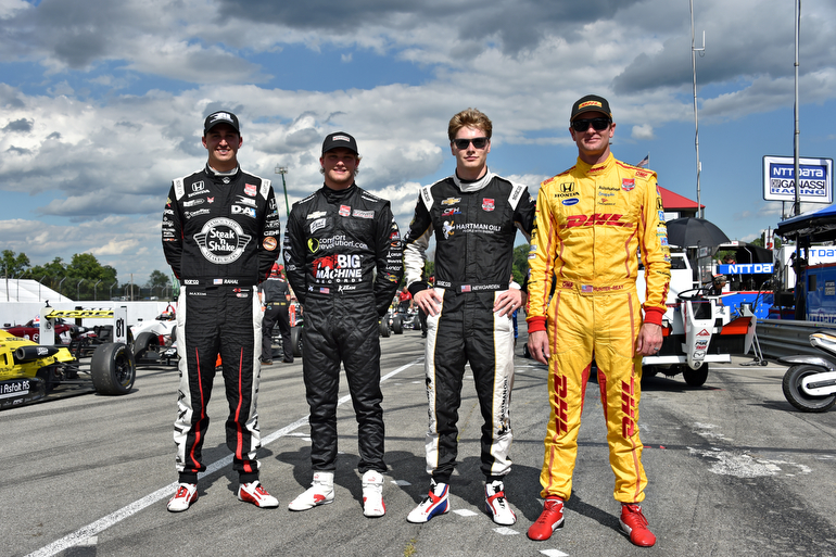 Americans Graham Rahal, Sage Karam, Josef Newgarden, and Ryan Hunter-Reay pose on the Mid-Ohio pit lane following their top-4 sweep at Iowa Speedway — Photo by: John Cote